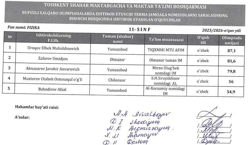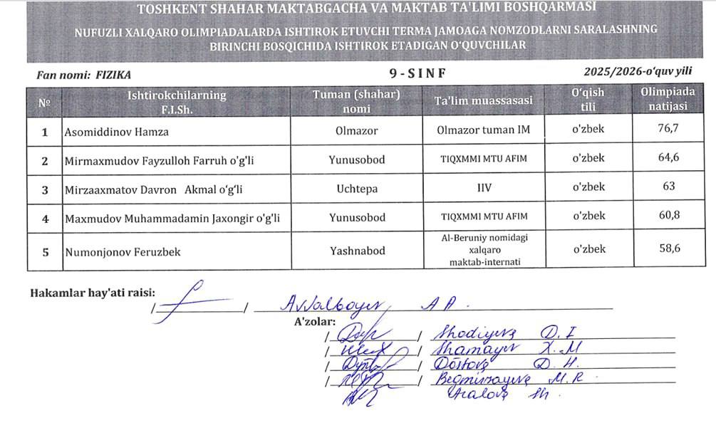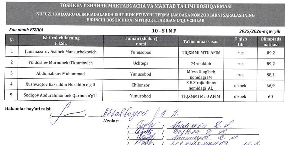 🇺🇿 Toshkent shahrida joylashgan umumta’lim maktablari, ixtisoslashtirilgan maktablar va akademik litseylar ichida FIZIKA fanidan maktabimiz oquvchilari eng ilgarilab ketgan oquvchilardan ekanligi juda faxrli holatdir:
