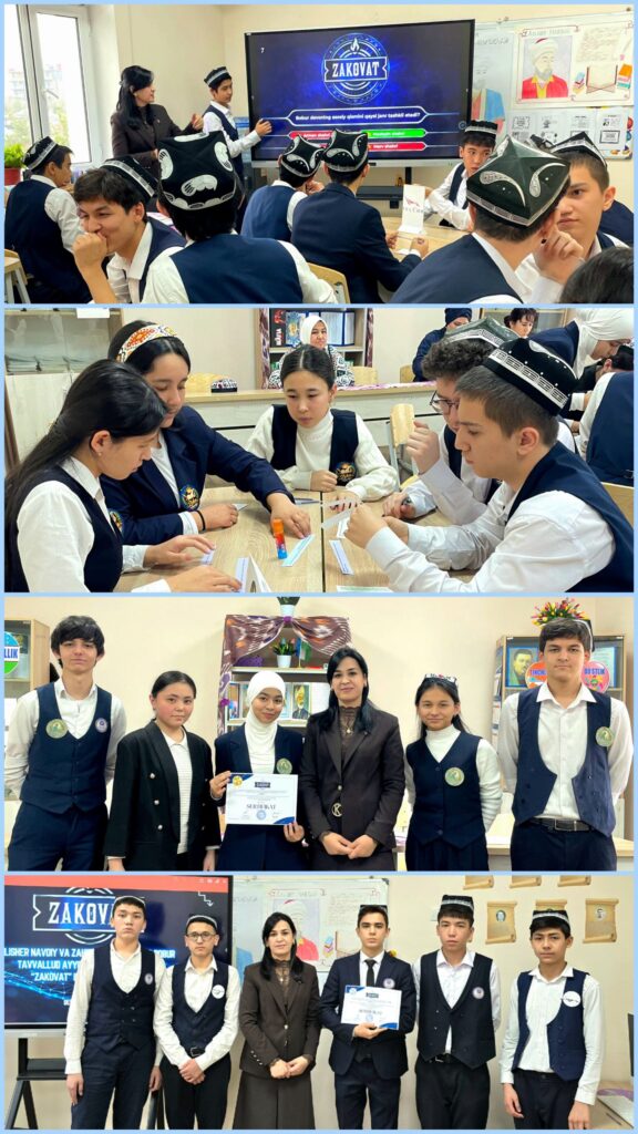 Ona tili va adabiyot fani o’qituvchisi Beshimova Nargiza tomonidan 9-sinf o’quvchilari Alisher Navoiyning 585 yilligi va Zahiriddin Muhammad Boburning 543 yilligi munosabati bilan «Zakovat intellektual o’yini » o’tkazildi.
